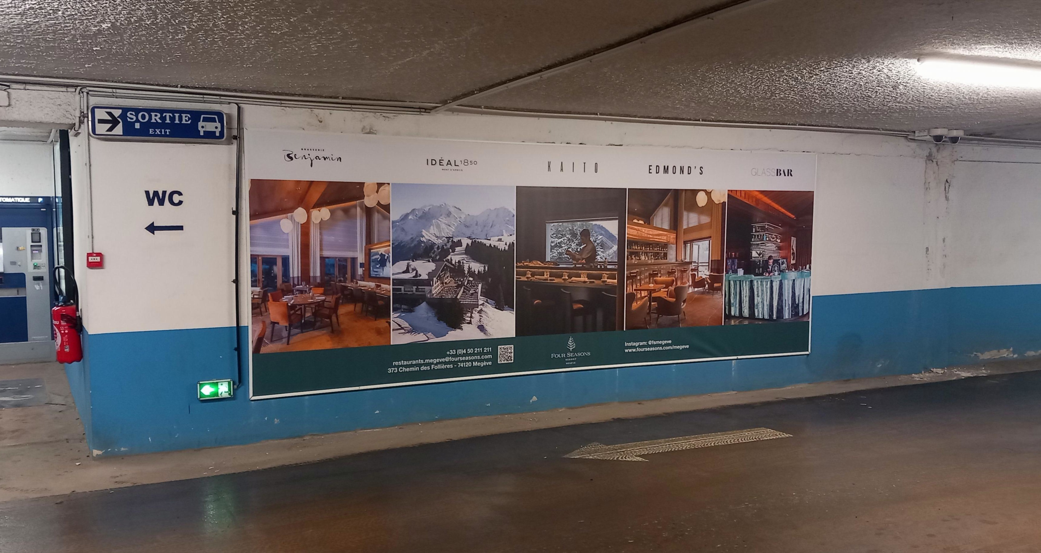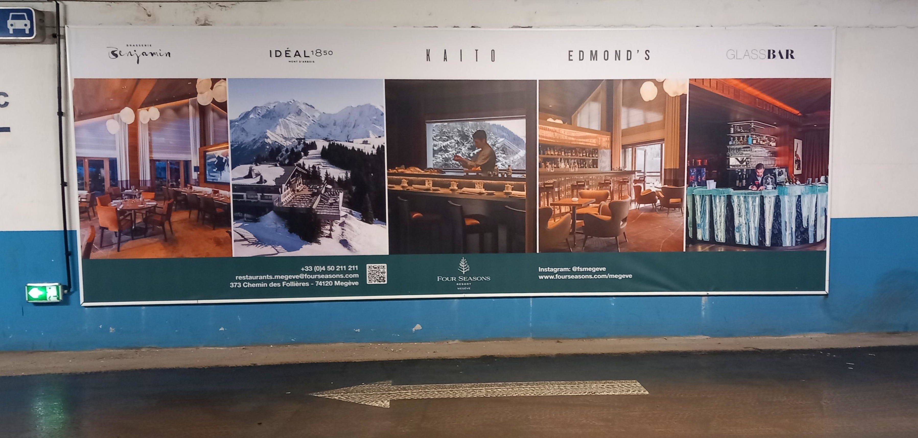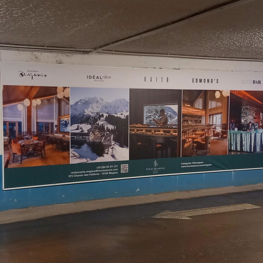 Pose d’une bâche tendue dans le parking central de Megève, pour présenter les différents établissements du Four Seasons à Megève.