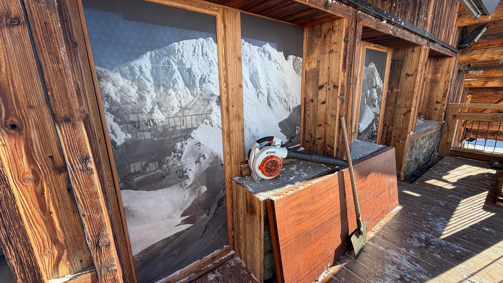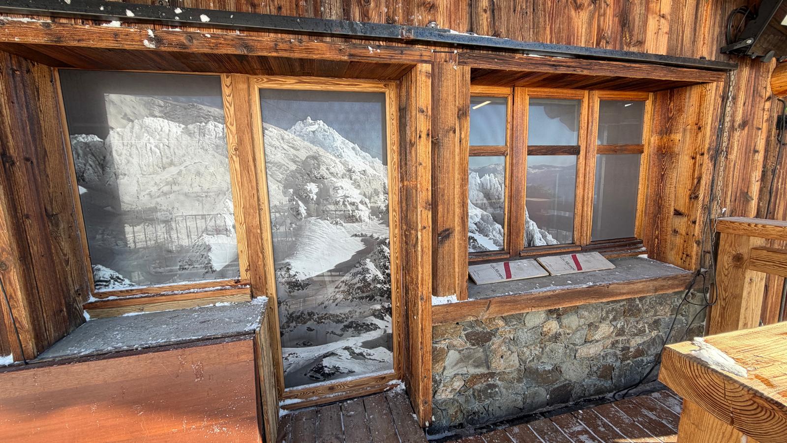 Réalisation du décor en adhésif microperforé sur les fenêtres du balcon de la Folie Douce à Val Thorens.