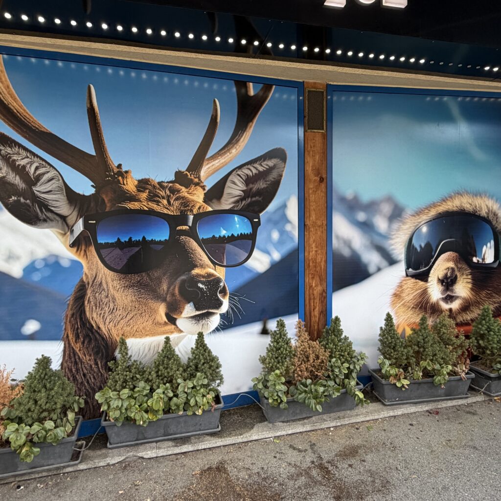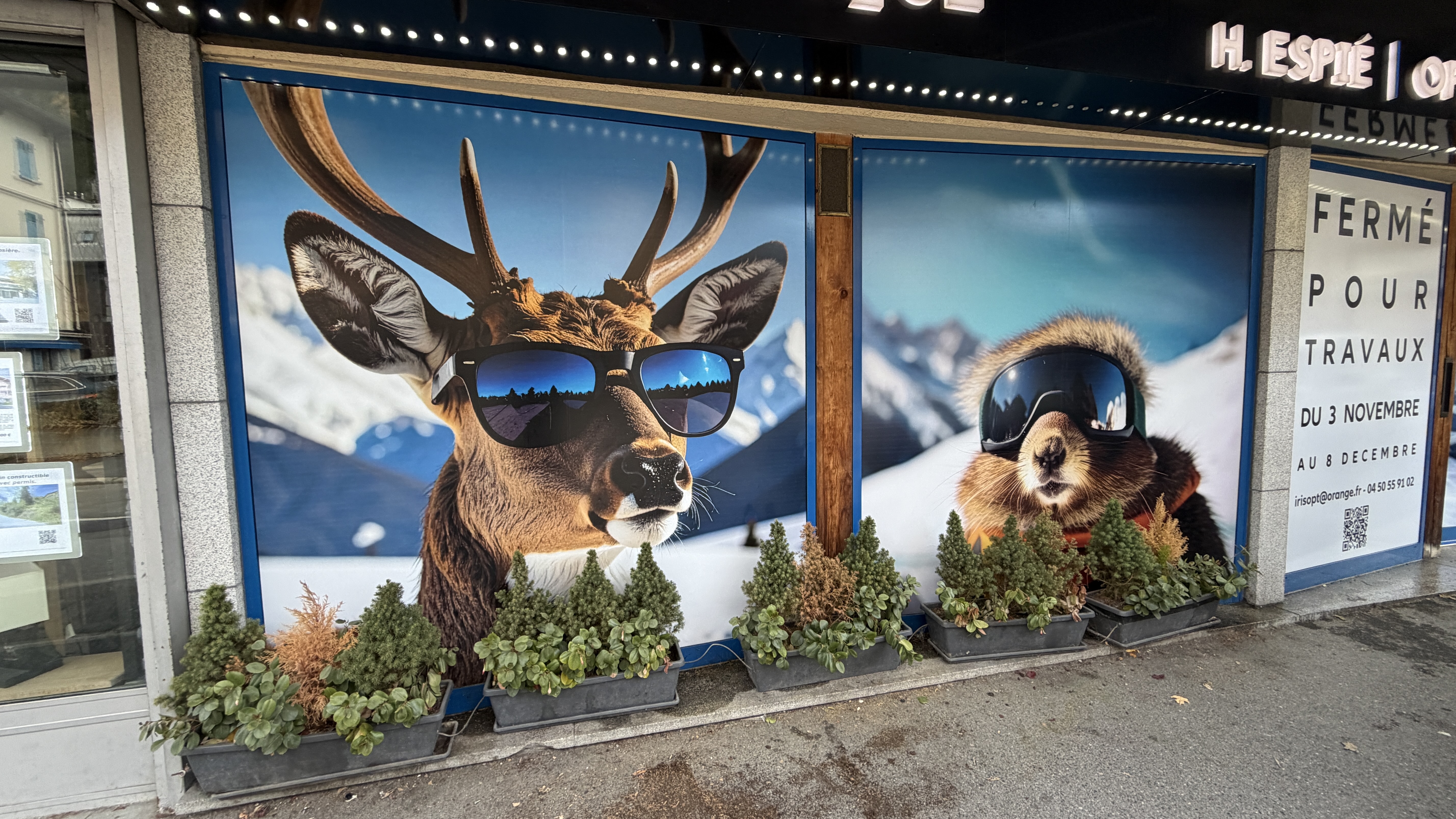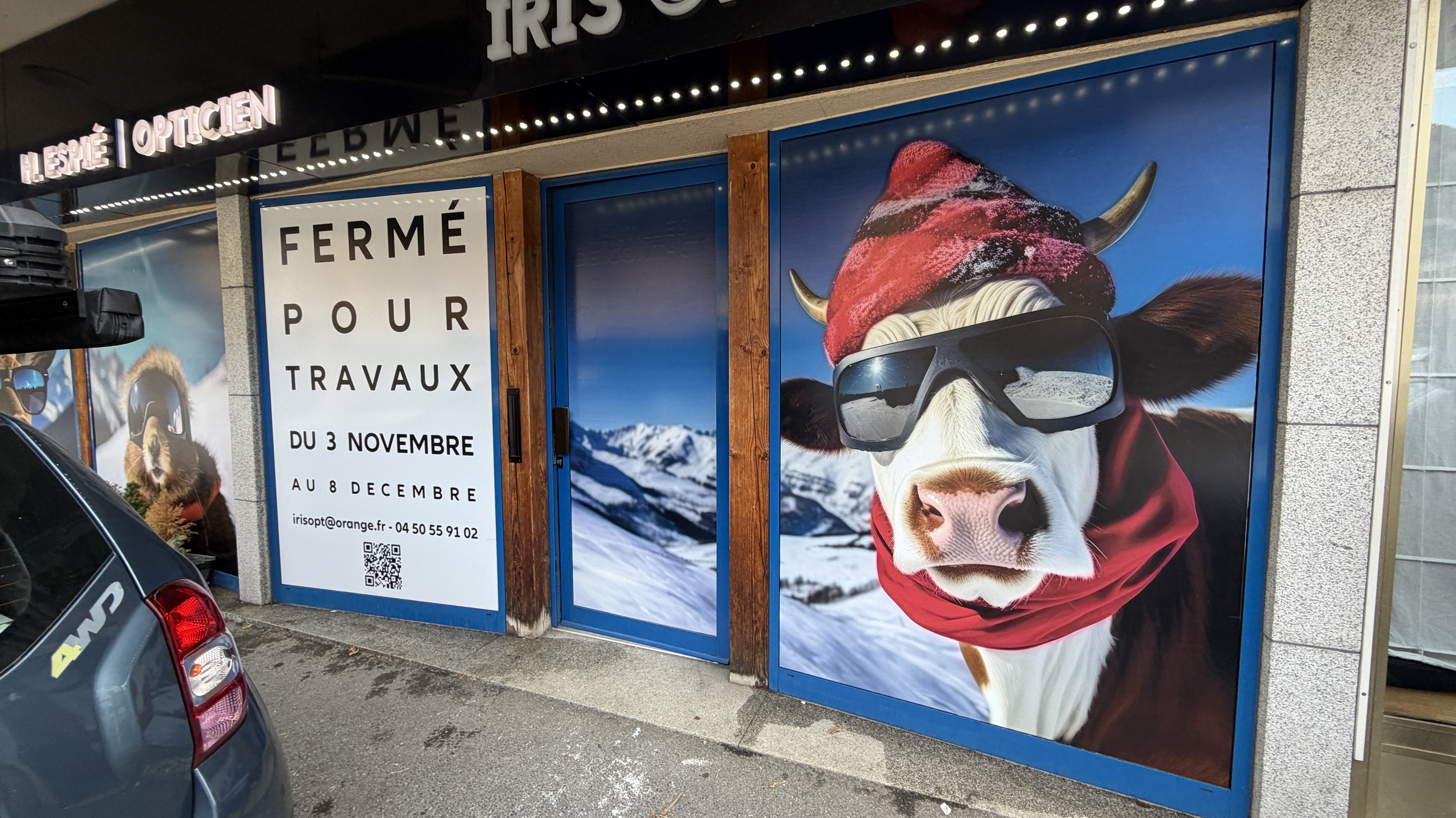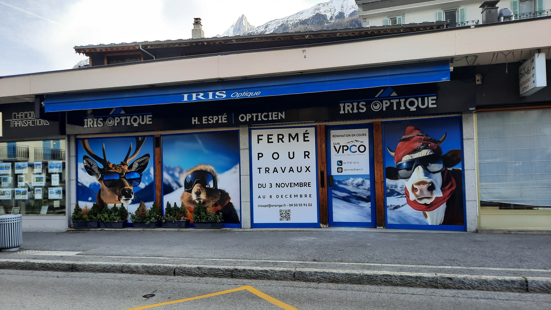 Décoration provisoire en adhésif complet pendant la période des travaux de la boutique Iris Optique à Chamonix.