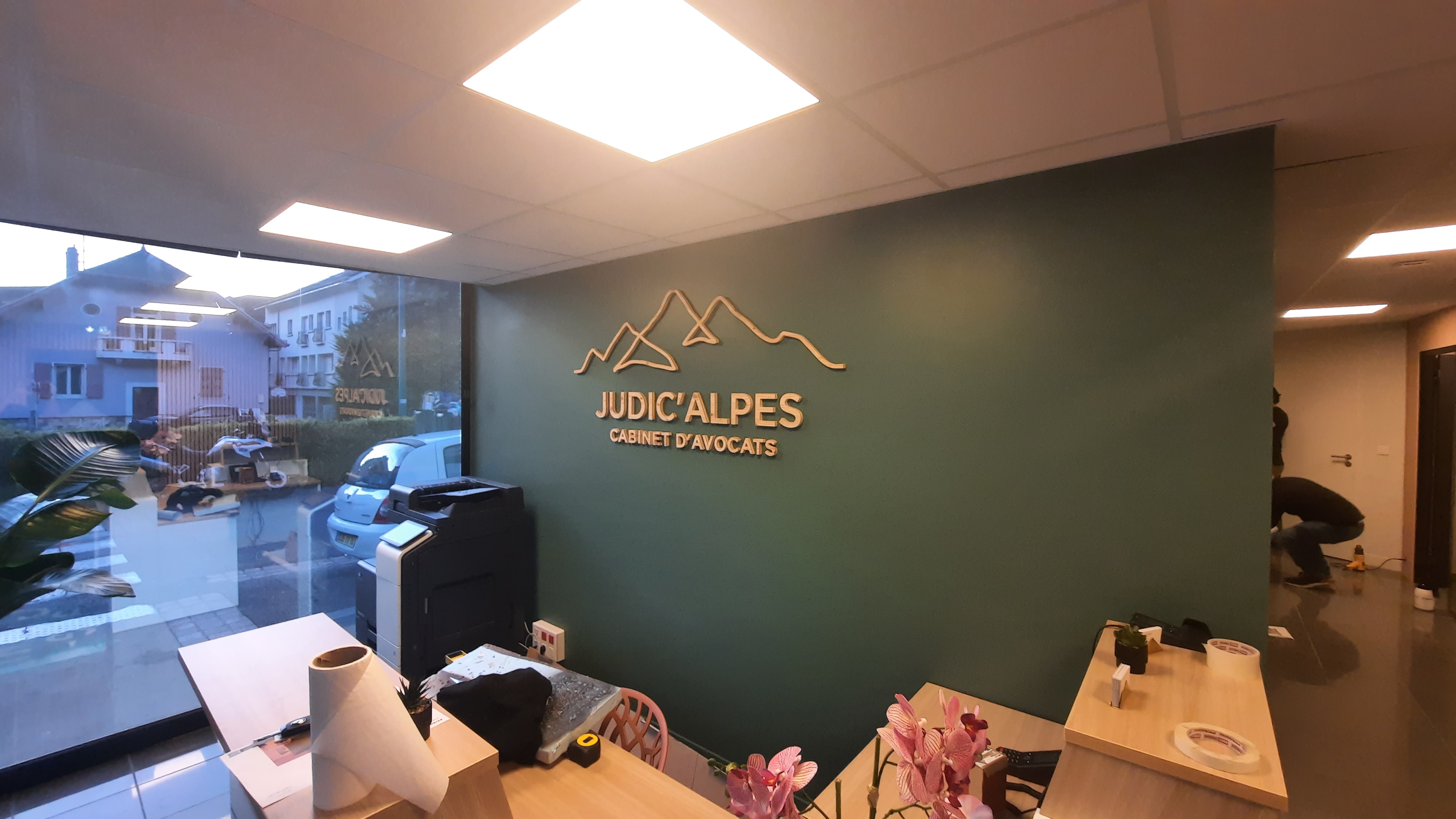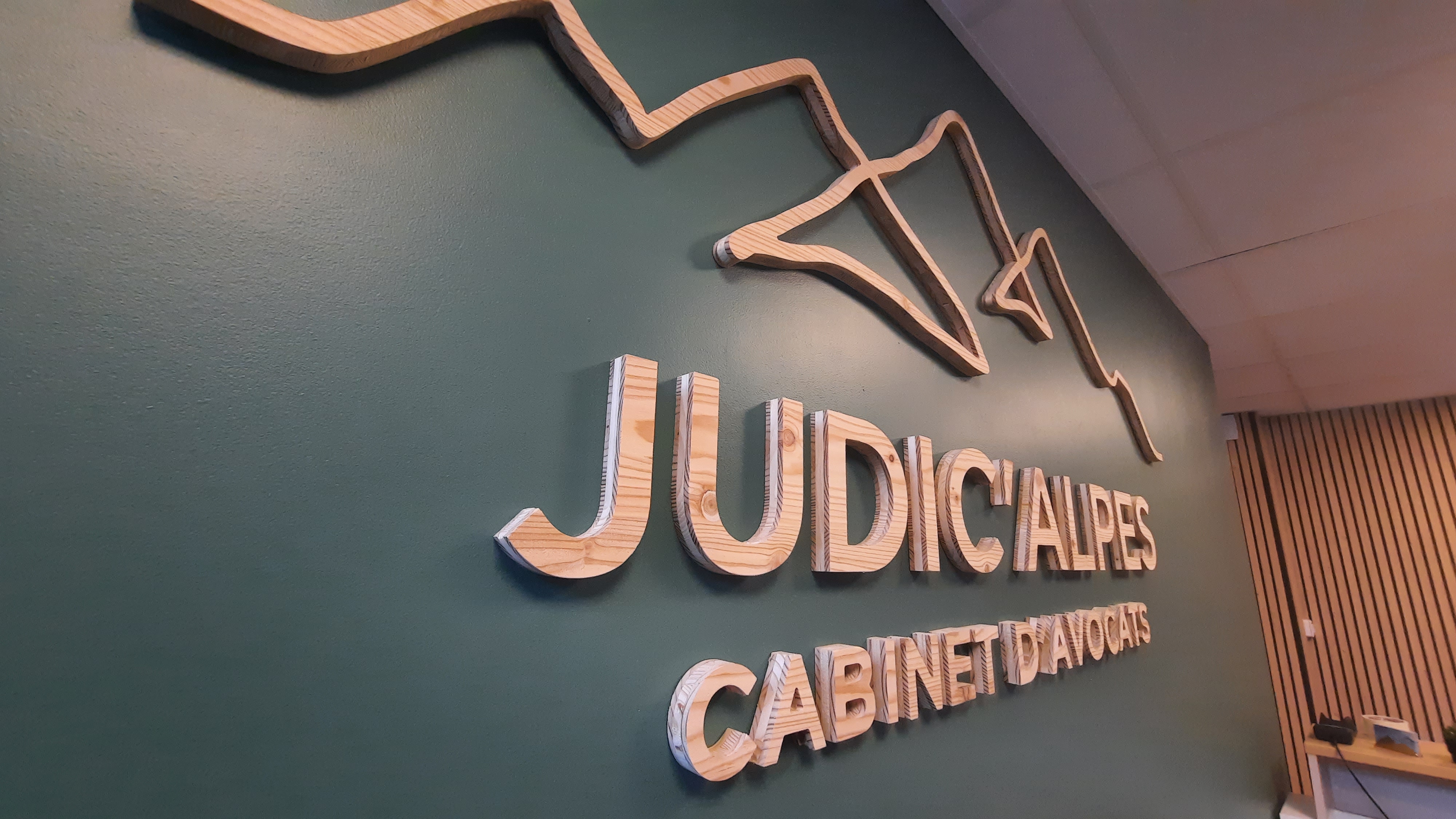 Nous avons réalisé pour le cabinet d’Avocats Judic’Alpes à Cluses, l’enseigne pour habiller l’accueil, en bois fraisé à la forme qui s’accorde parfaitement à l’environnement. Nous avons également décoré les vitrines intérieurs pour plus d’intimité, en adhésif dépoli découpé à la forme.