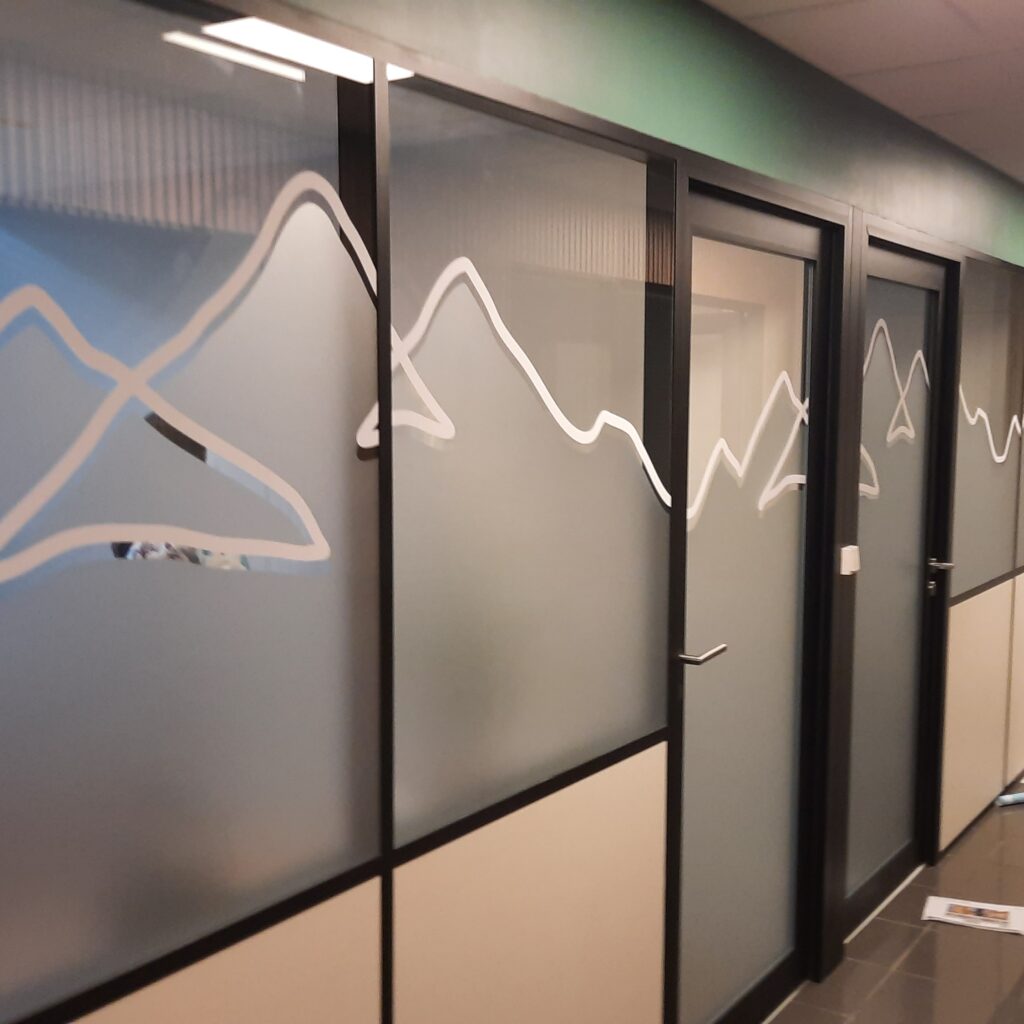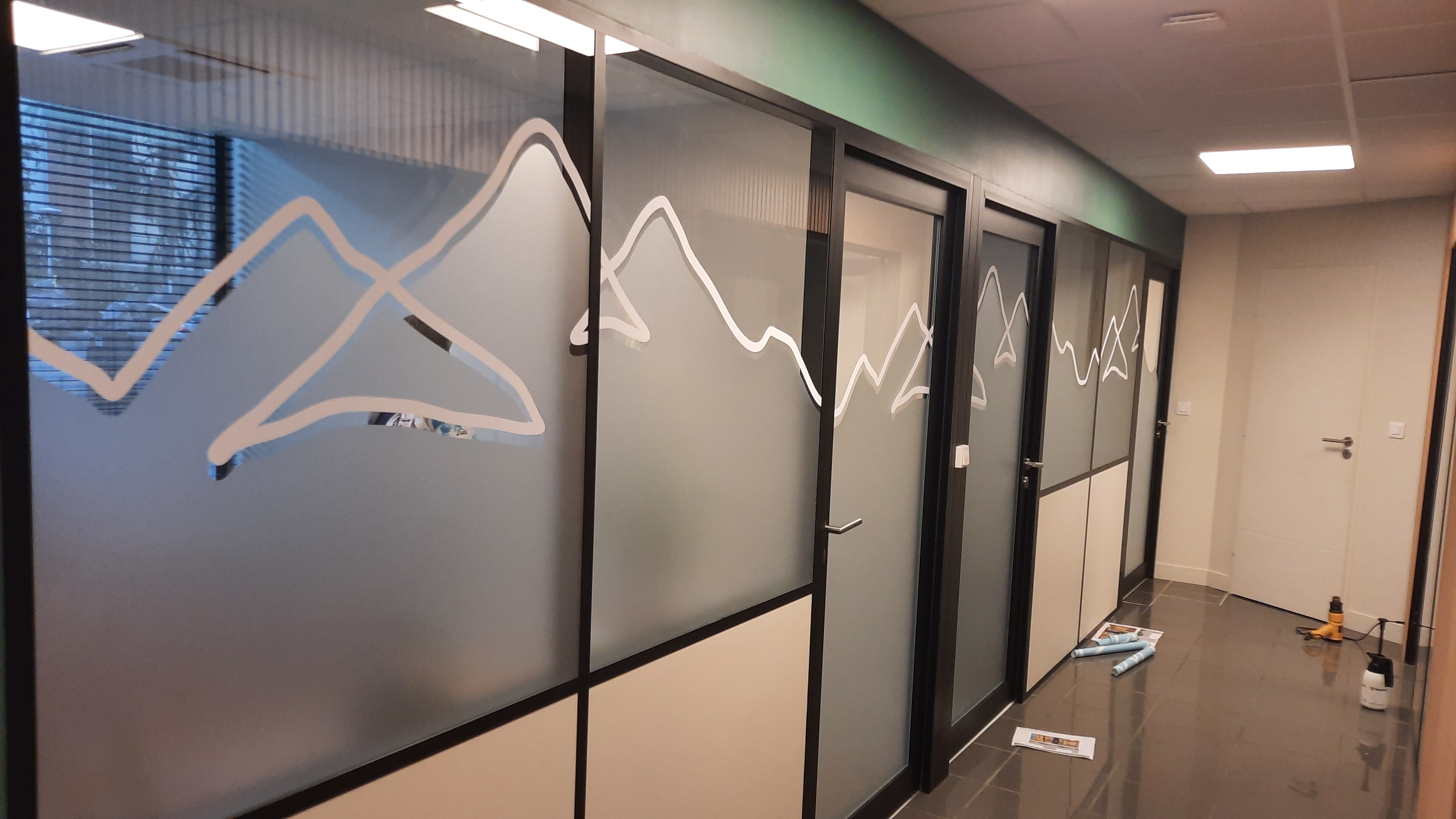 Nous avons également décoré les vitrines intérieurs pour plus d’intimité, en adhésif dépoli découpé à la forme.