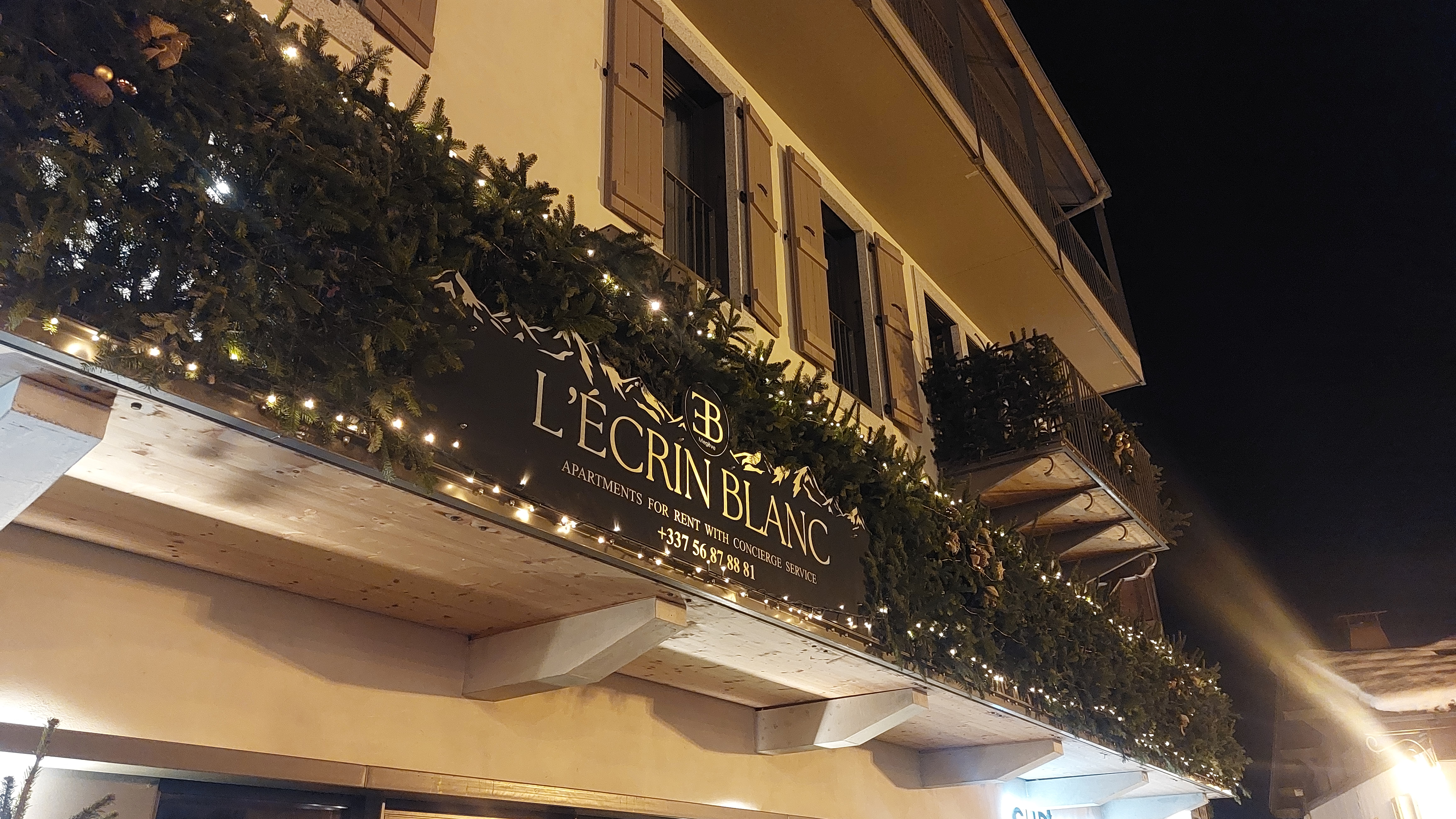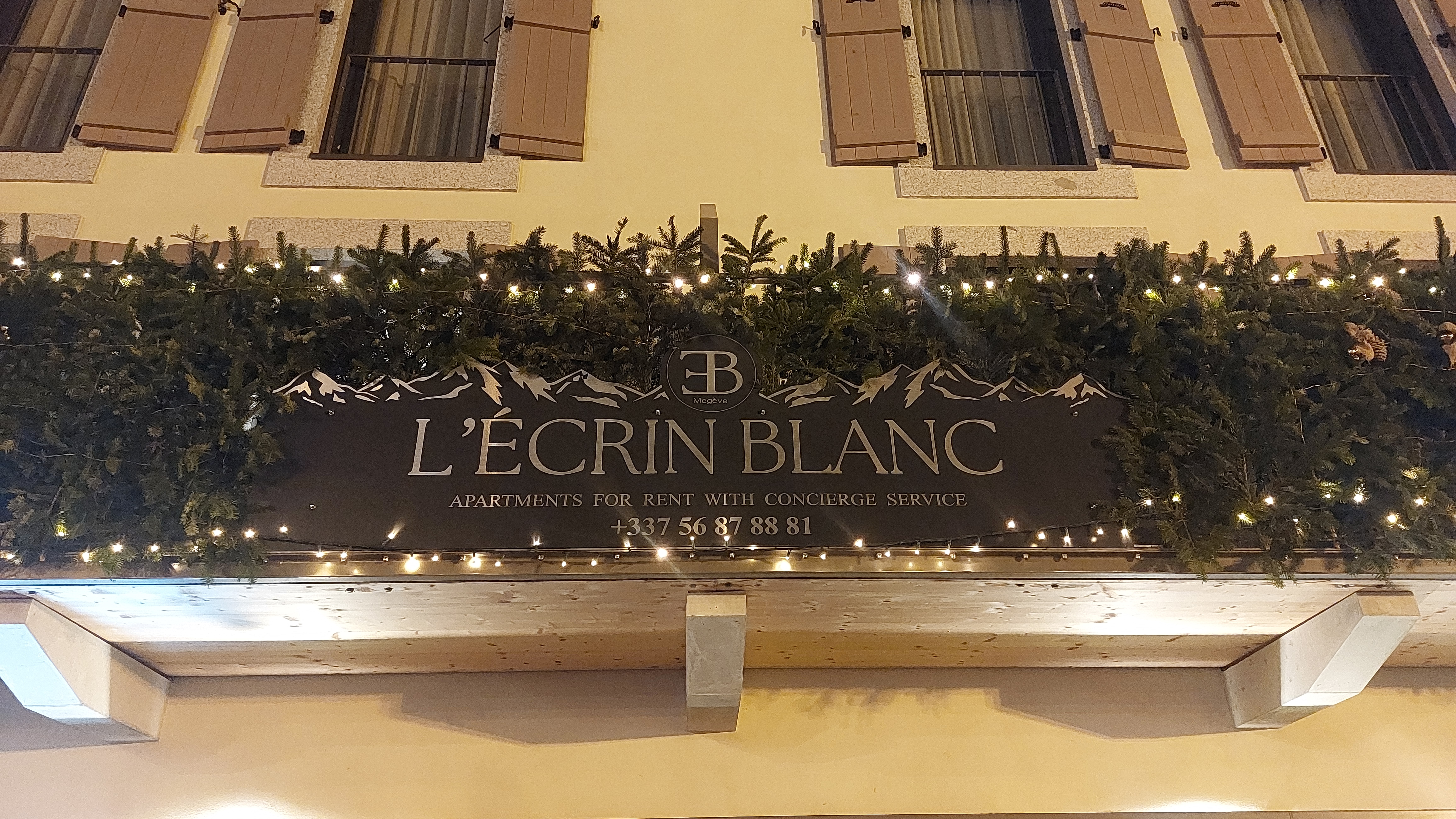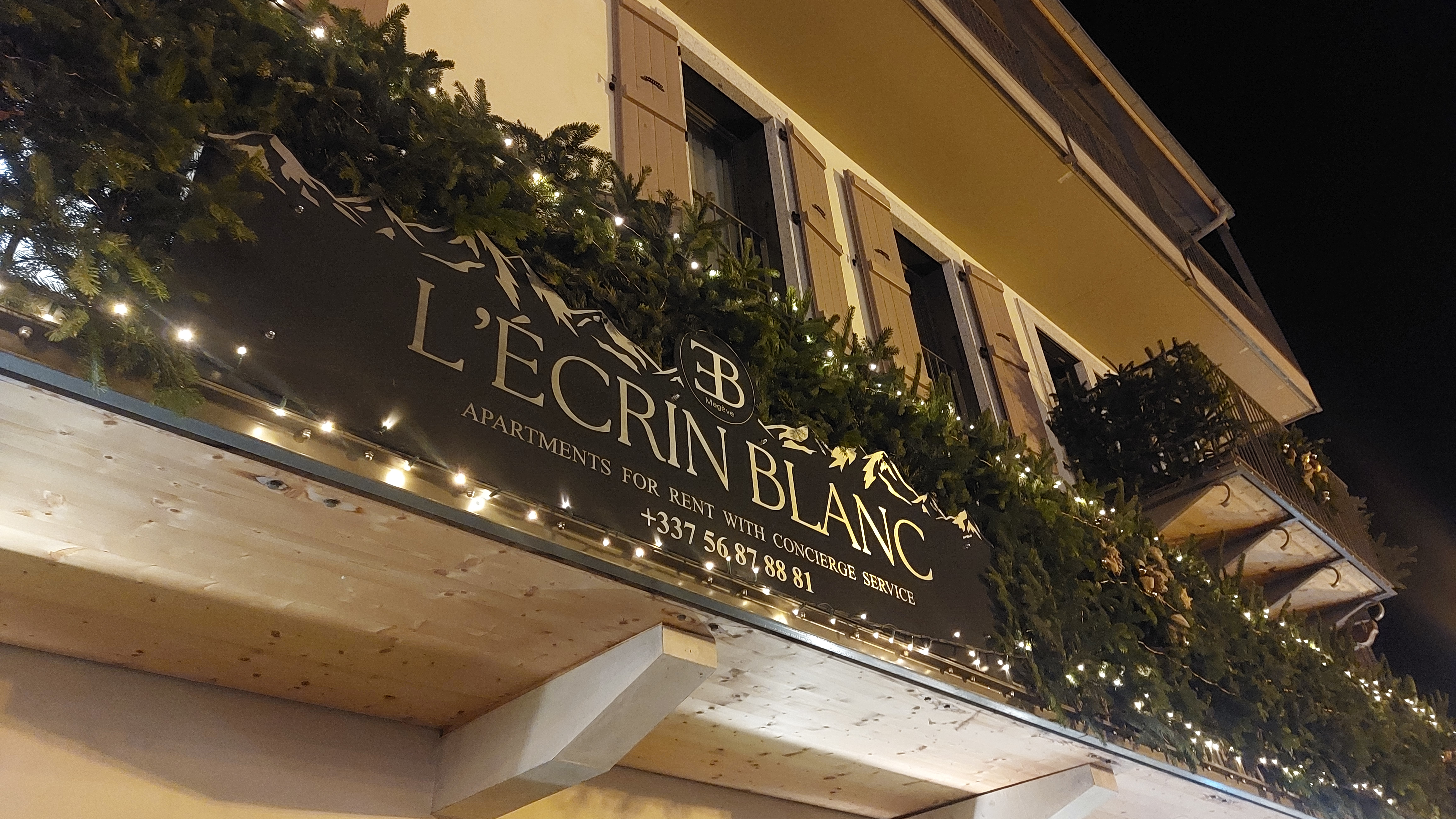 Nouvelle enseigne pour l’Ecrin Blanc en plein centre de Megève. Installation sur balcon.