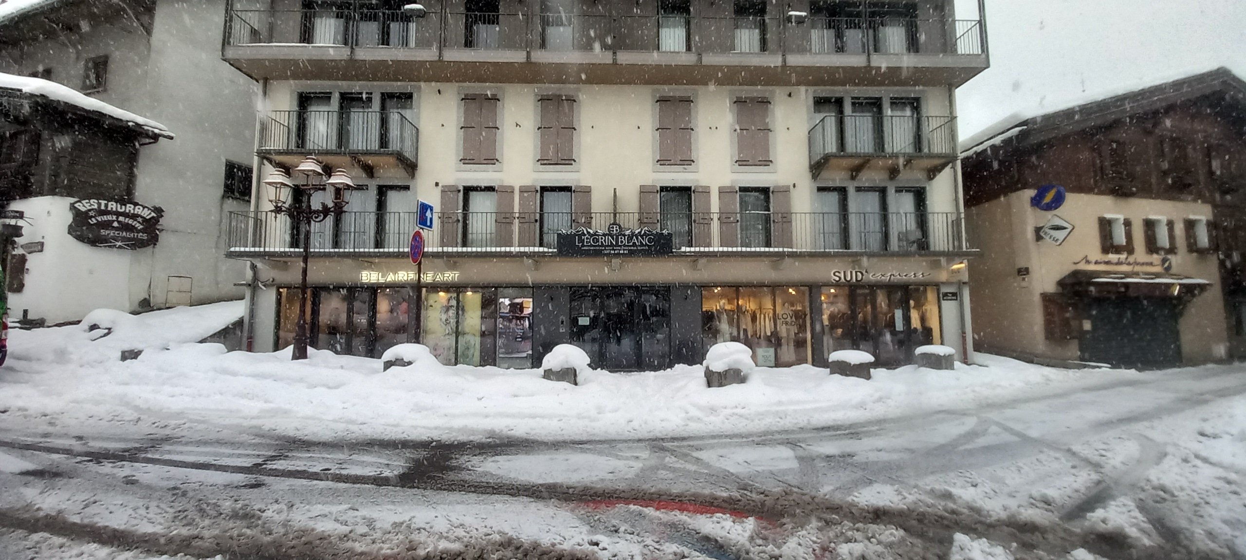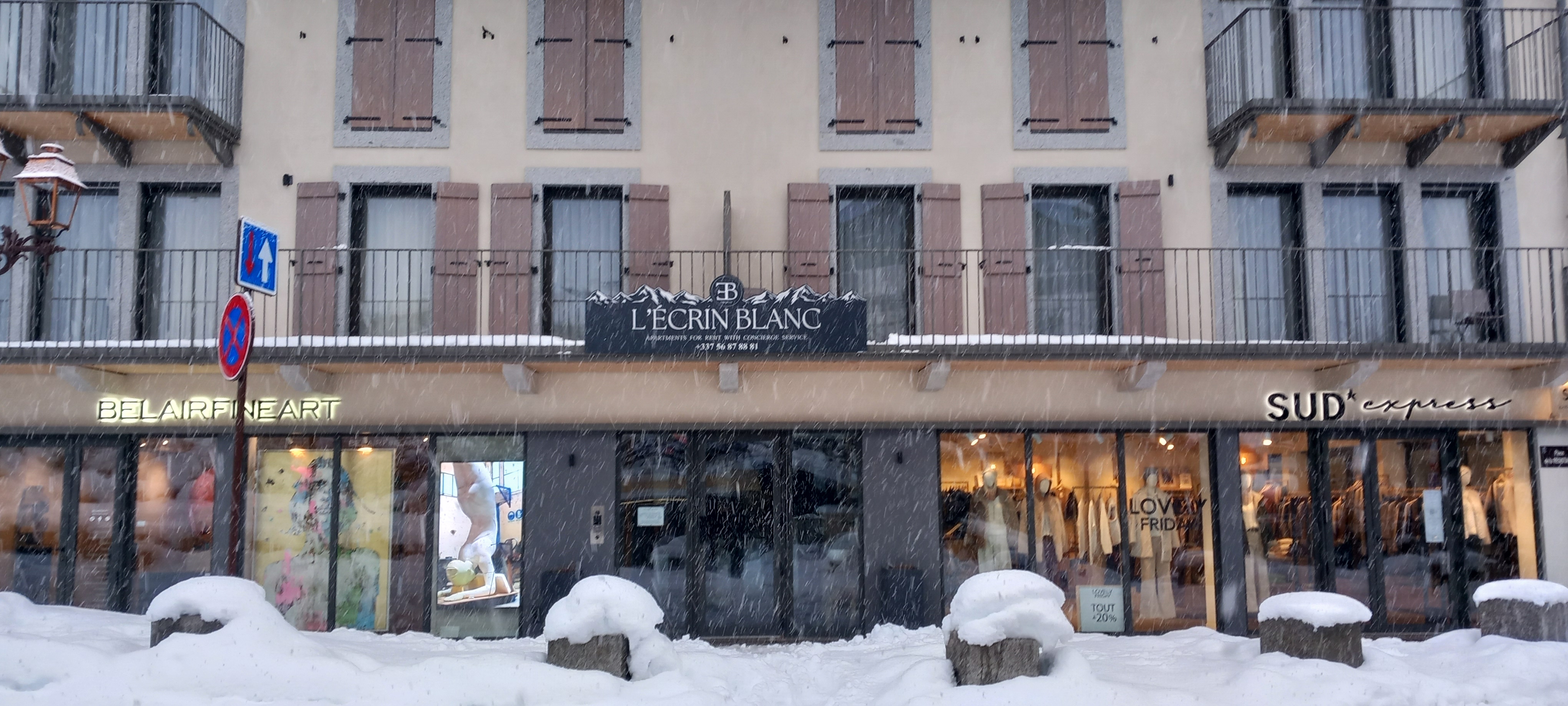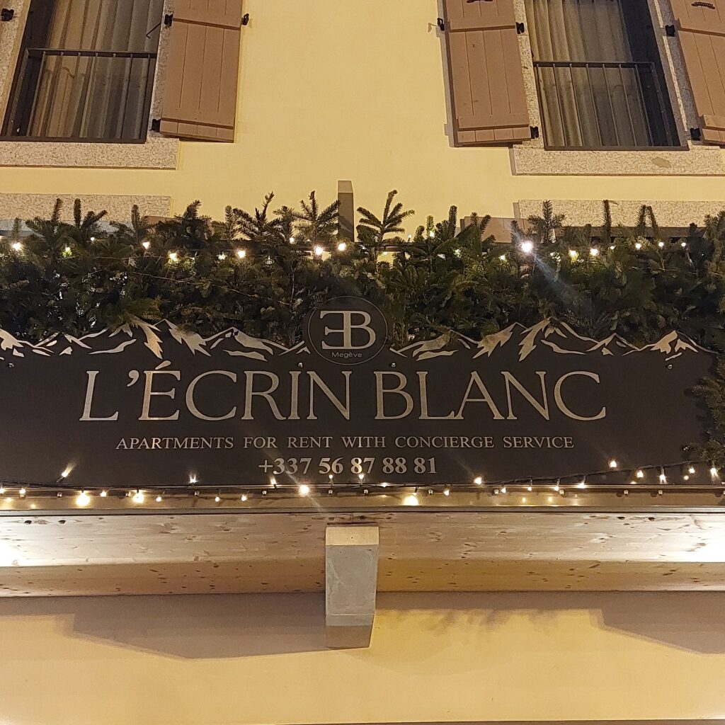 Nouvelle enseigne pour l’Ecrin Blanc en plein centre de Megève. Installation sur balcon.