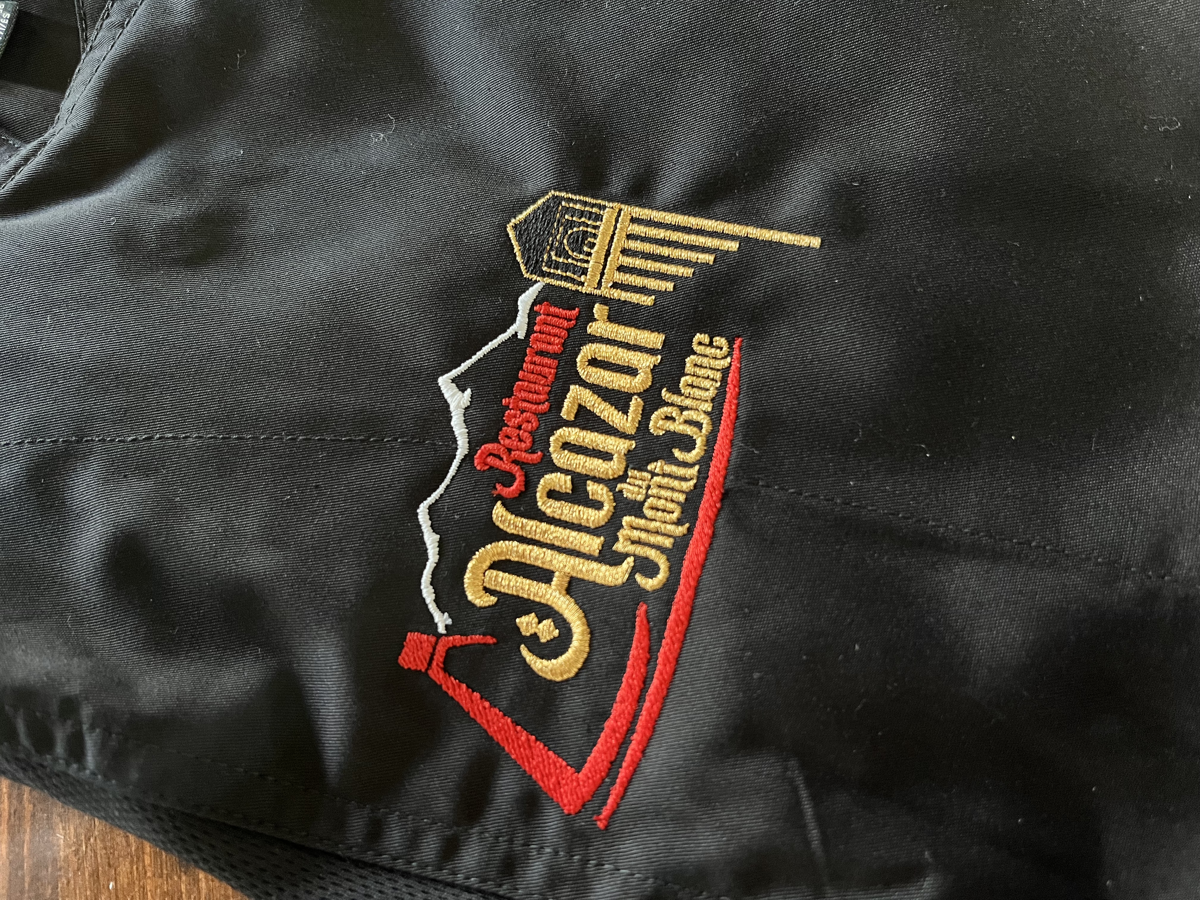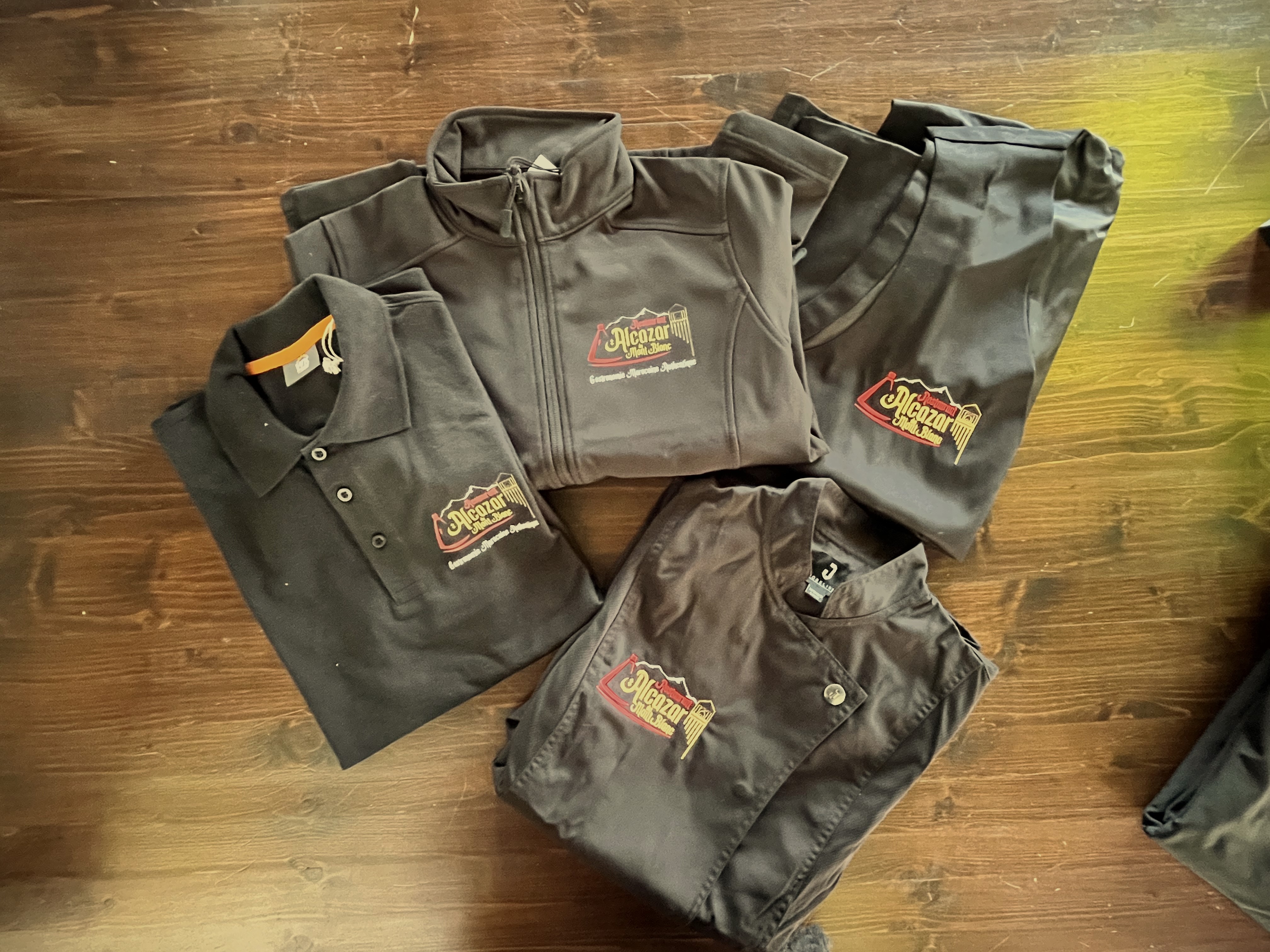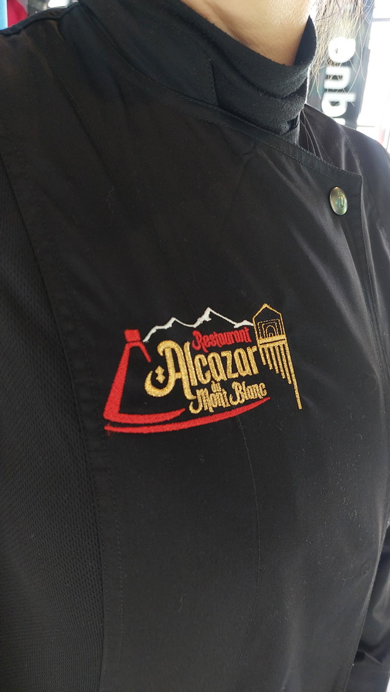 Réalisation de marquage textile personnalisé pour le restaurant Alcazar du Mont-Blanc. Logo appliqué avec soin sur les tenues du personnel pour un rendu professionnel, élégant et cohérent avec l’identité de l’établissement.
