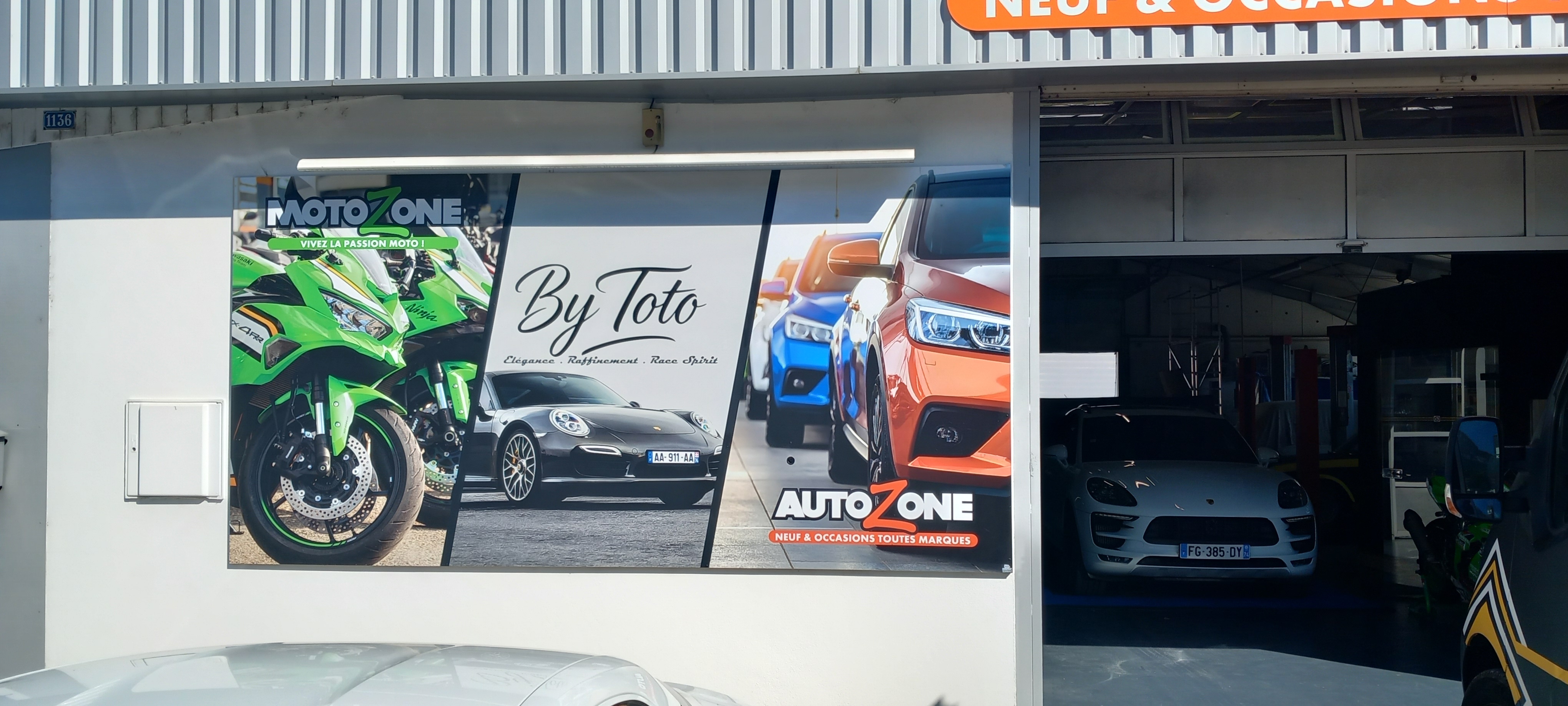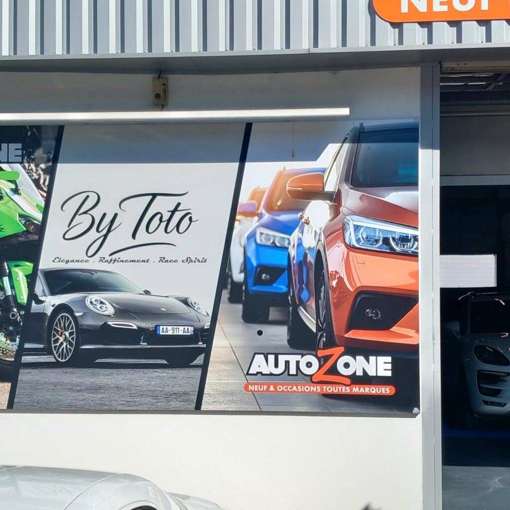 Installation d’un panneau enseigne By Toto pour la présentation d’un nouveau service automobile haut de gamme chez Auto Zone et Moto Zone à Sallanches.