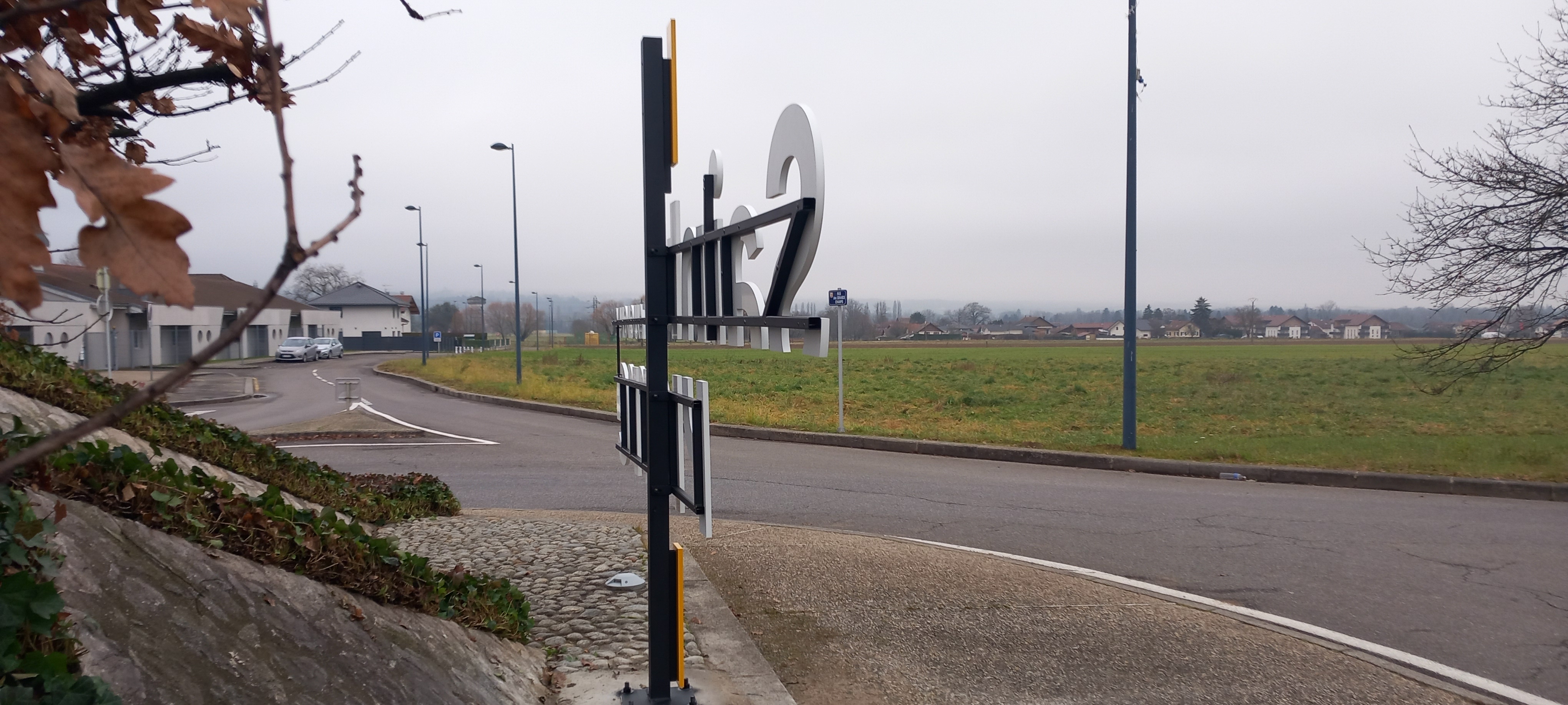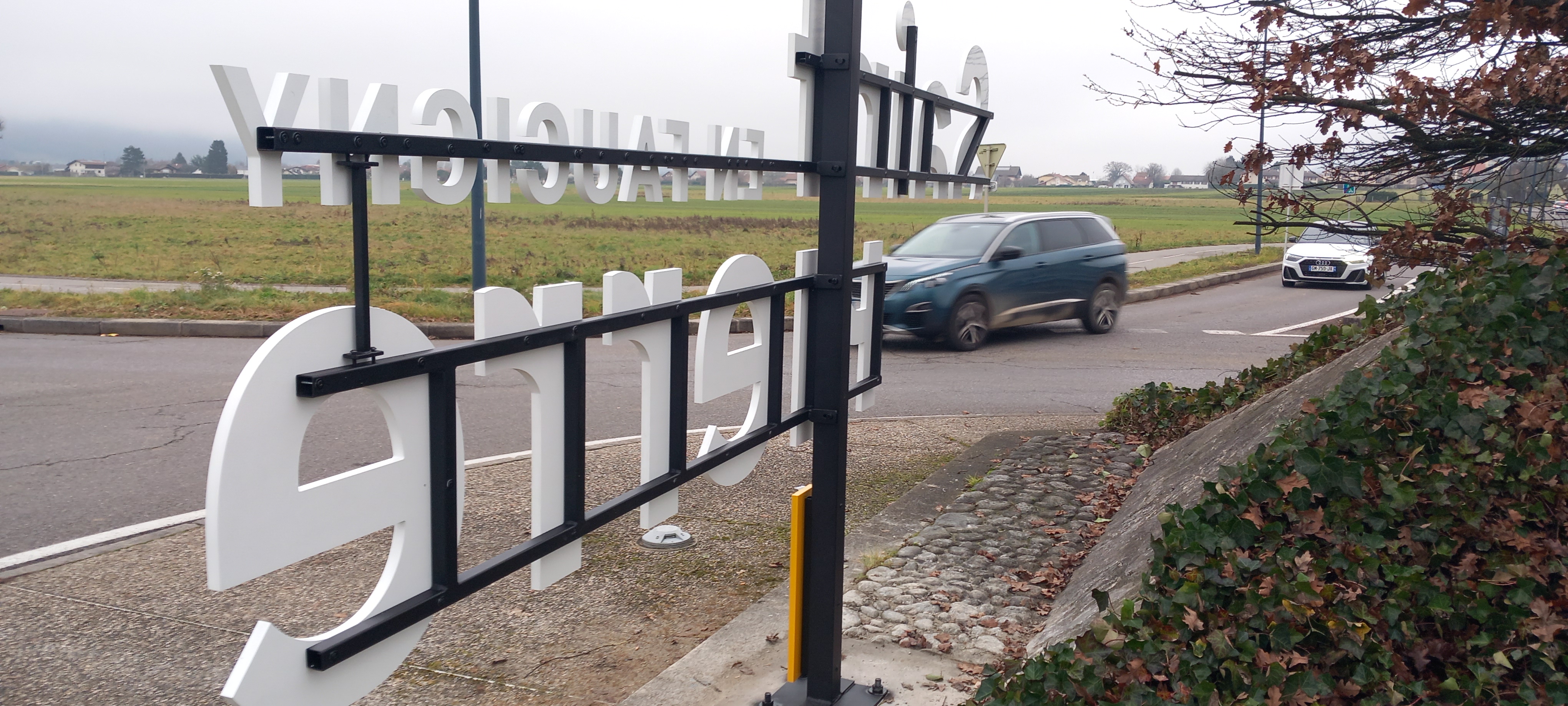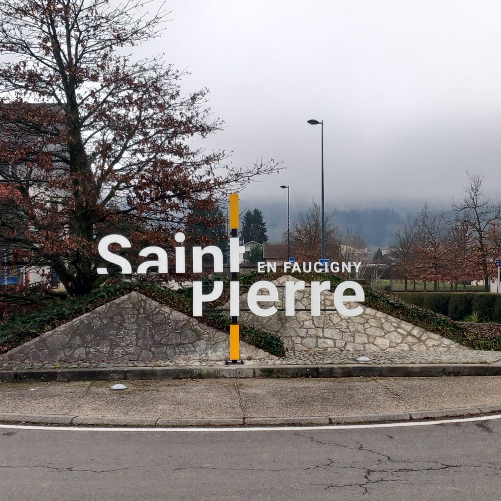 Création sur mesure, fabrication et installation de la nouvelle enseigne à l’entrée de ville au rond point de Saint Pierre en Faucigny.