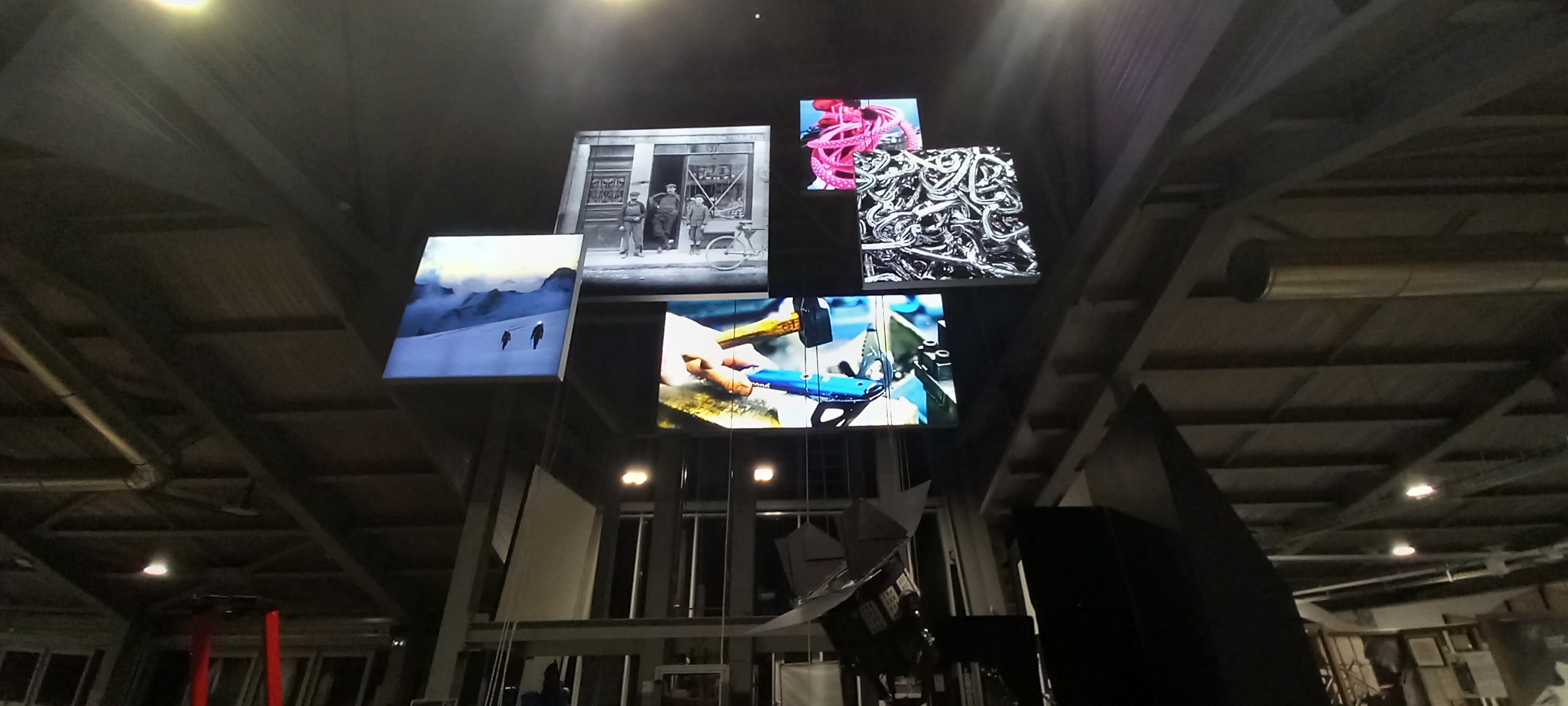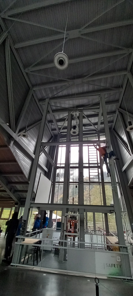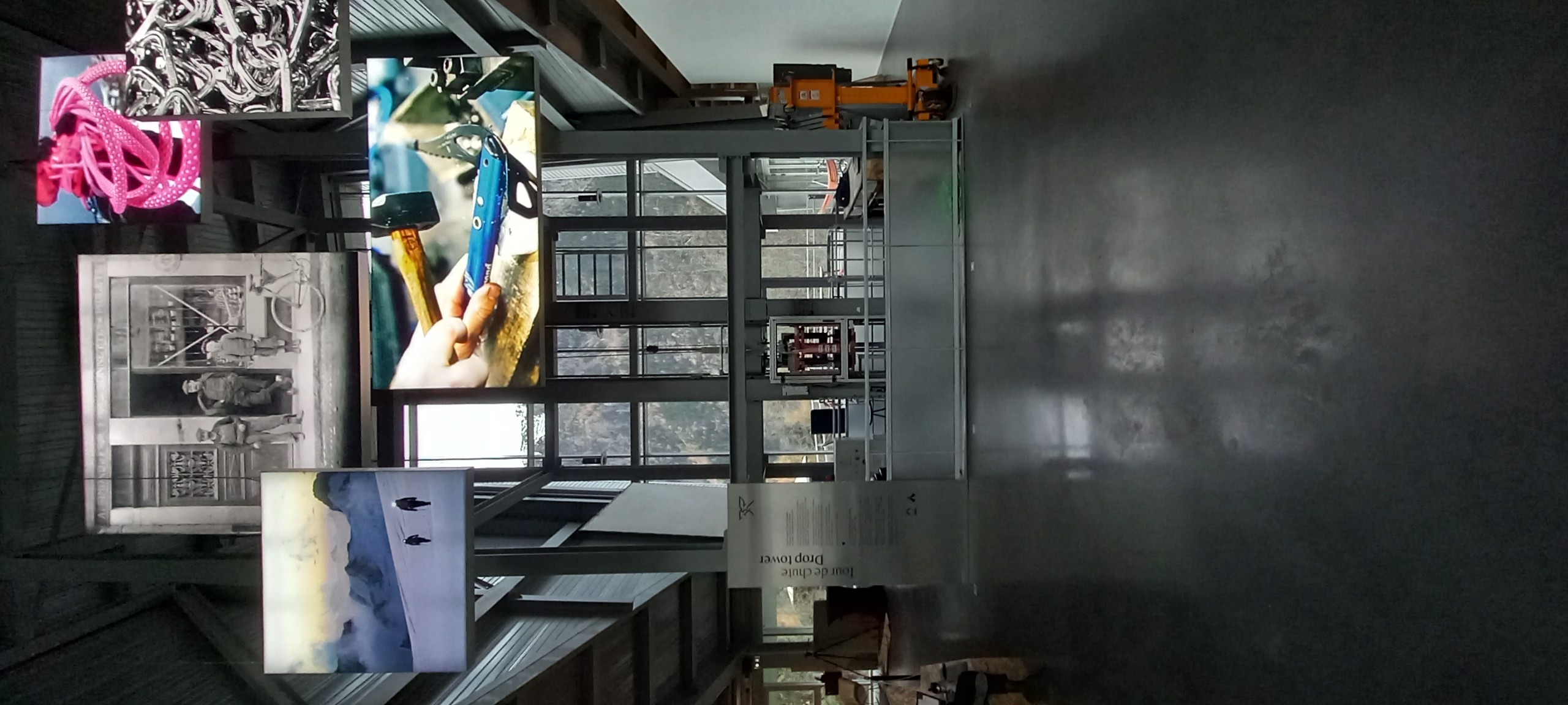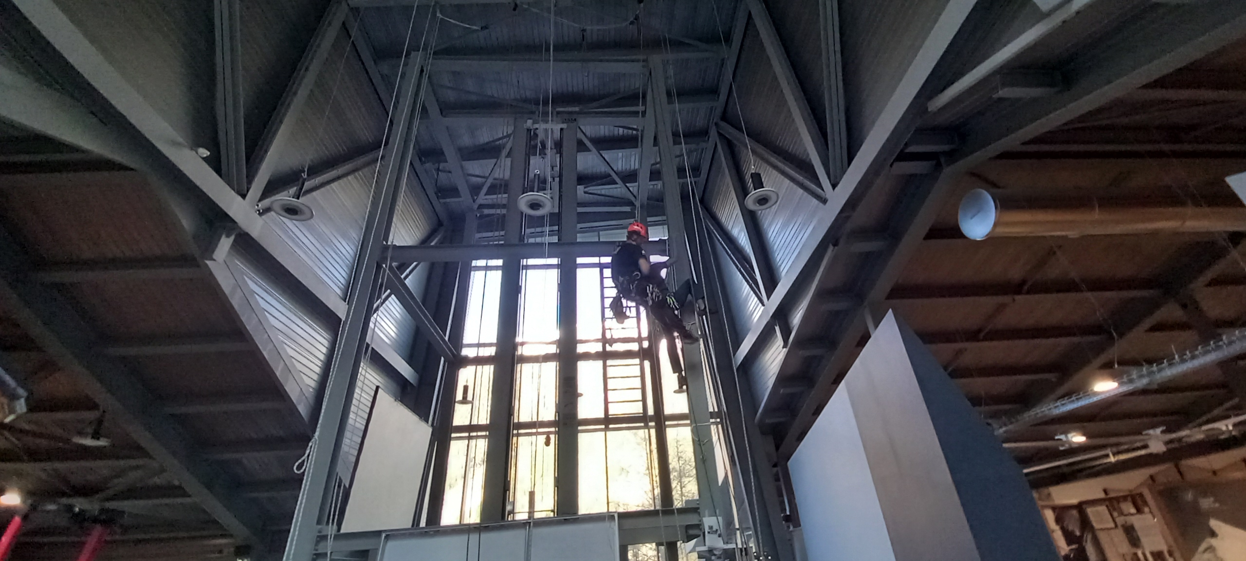 Installations de plusieurs toiles tendues dans le hall de l’établissement SIMOND à Chamonix, avec intervention des cordistes.