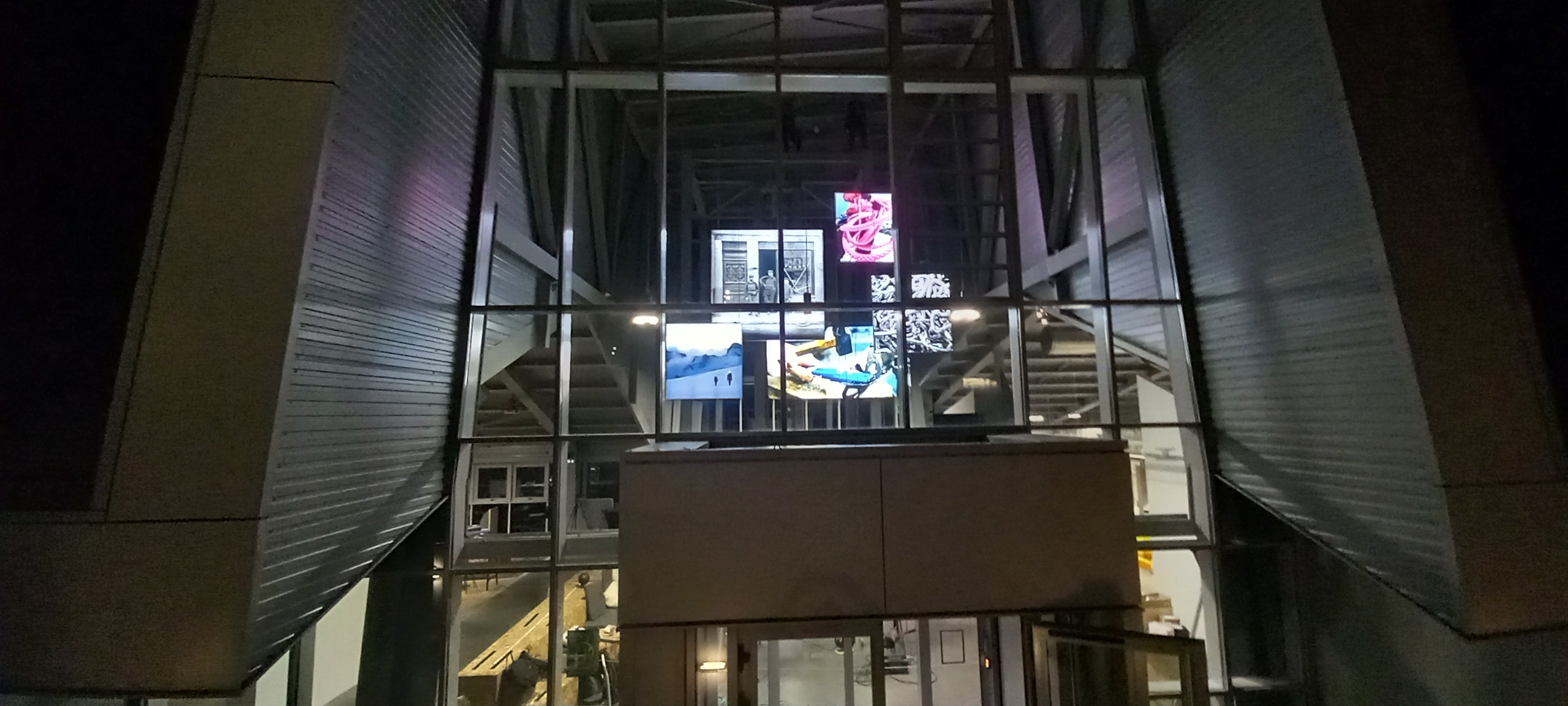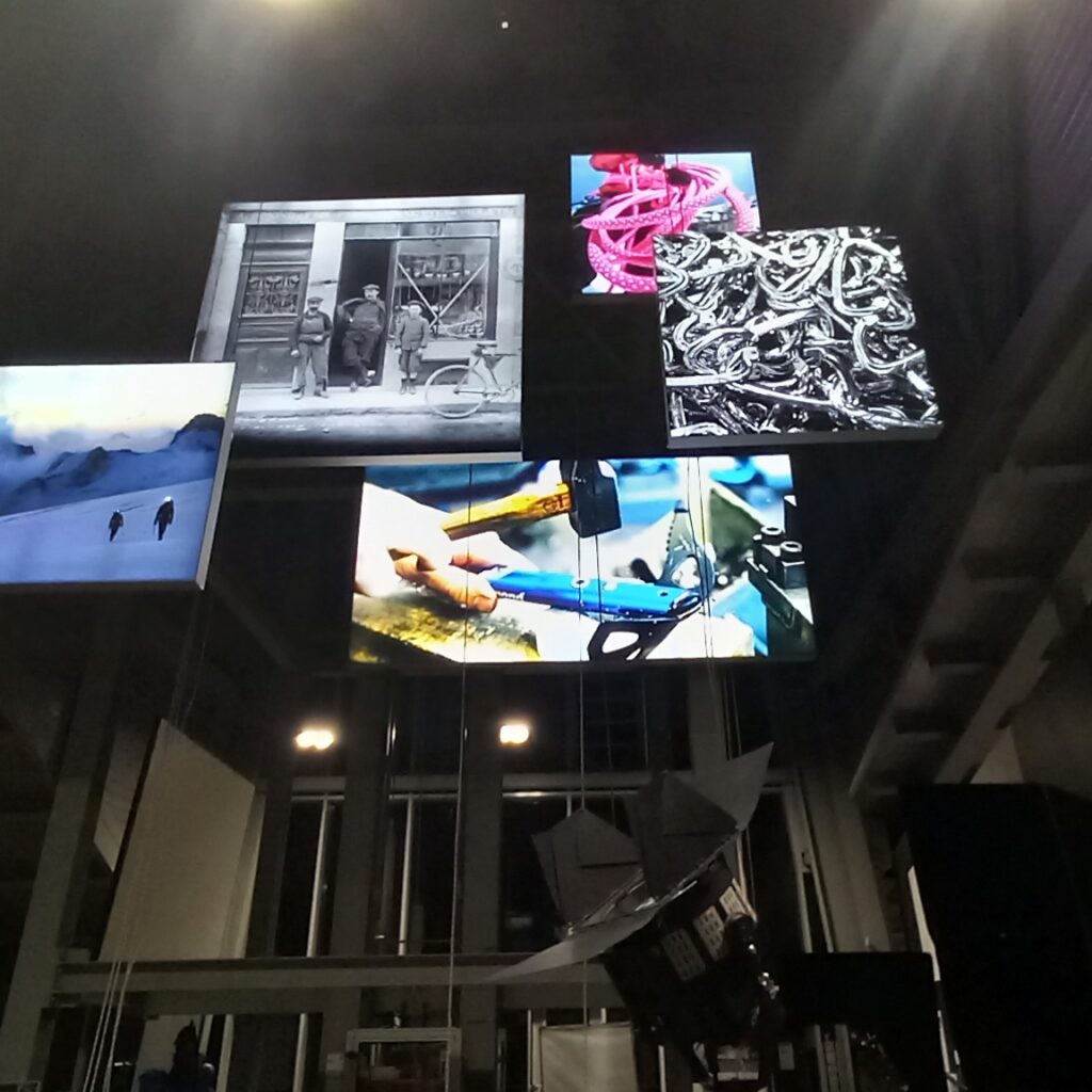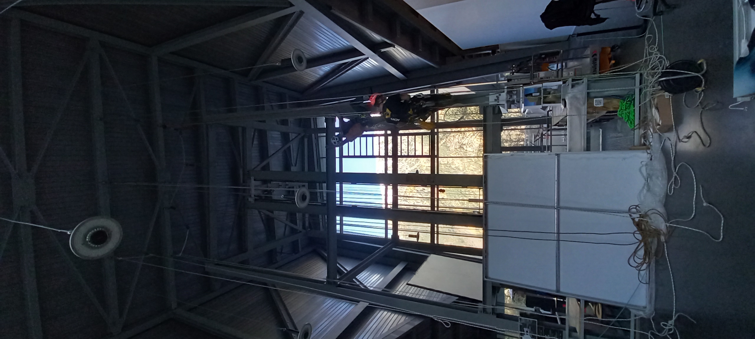 Installations de plusieurs toiles tendues dans le hall de l’établissement SIMOND à Chamonix, avec intervention des cordistes.