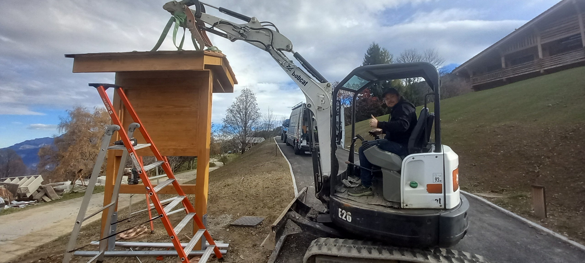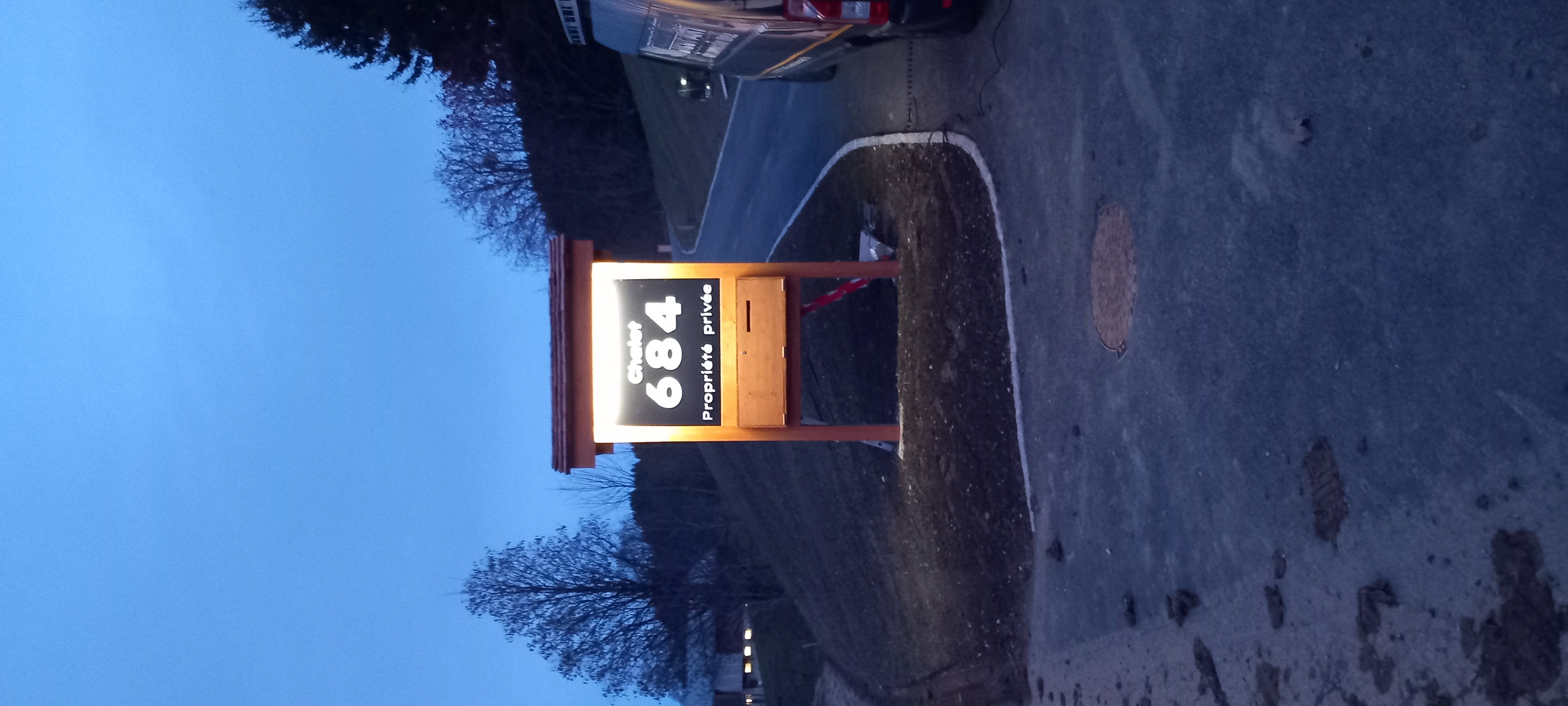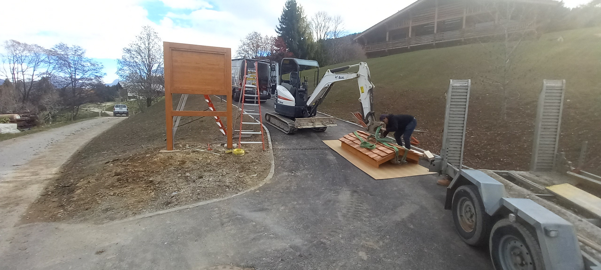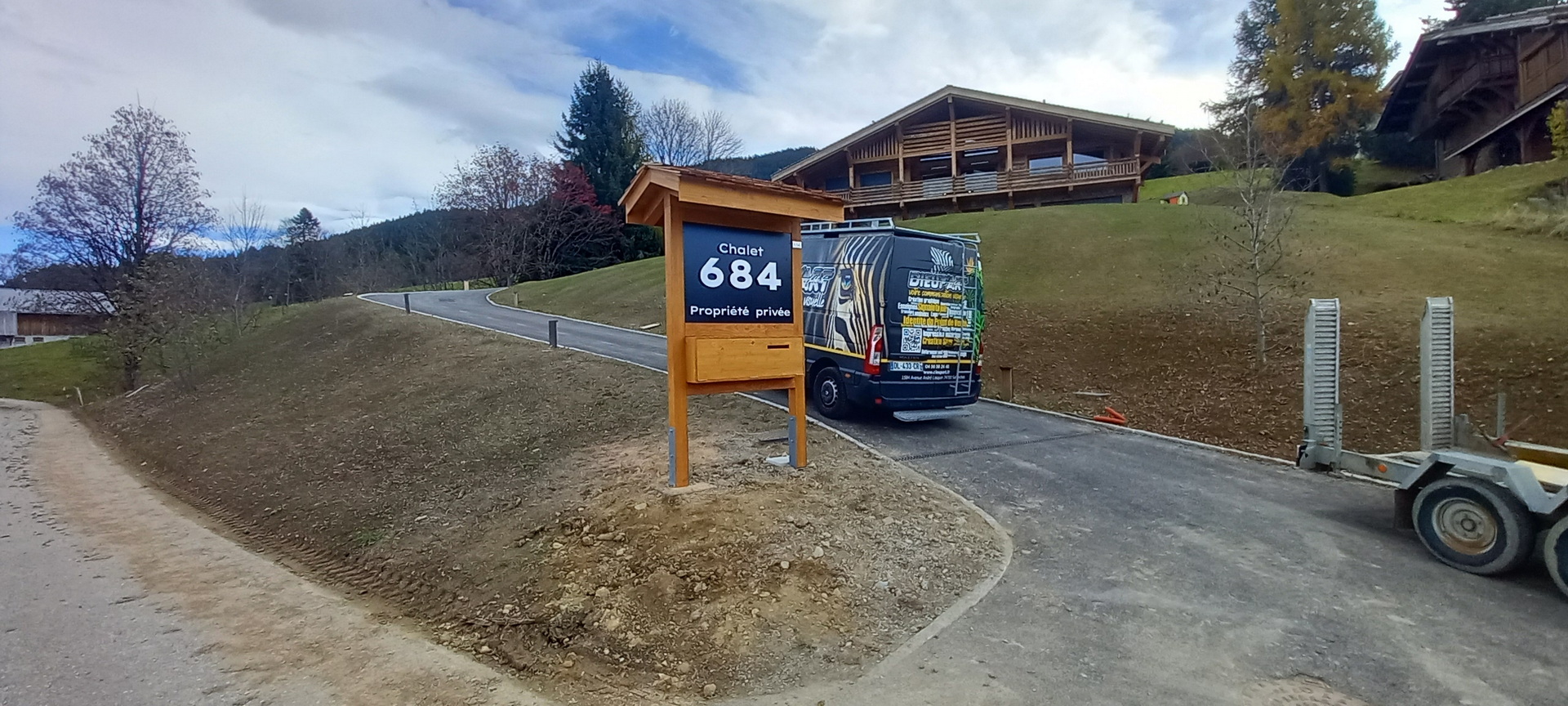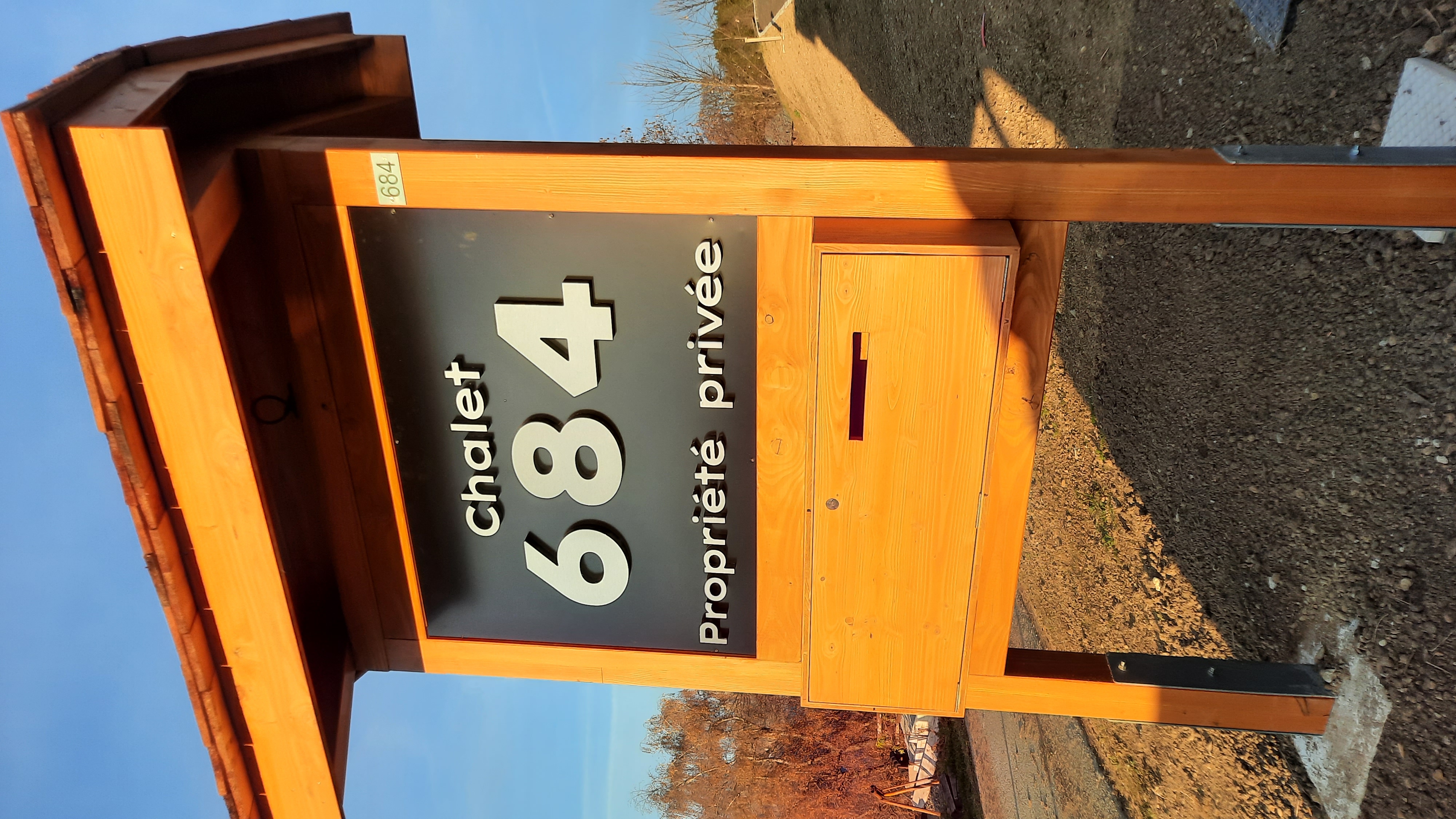Fabrication d’un totem en bois sur mesure pour la visibilité du chalet avec intégration de la boîte aux lettres.