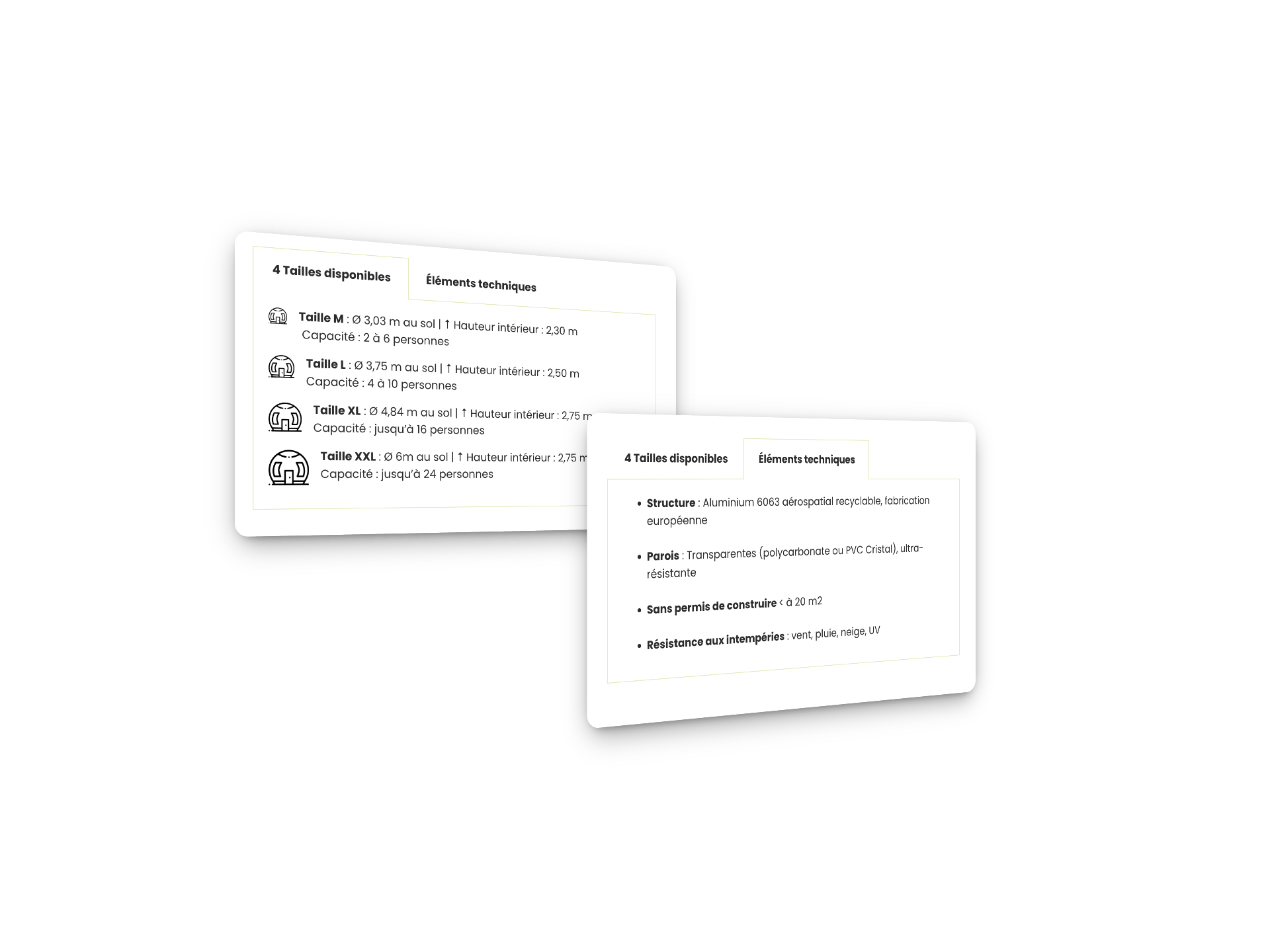 Disponible en quatre tailles jusqu’à 6 m de diamètre, elle s’installe sans permis (< 20 m²) et s’utilise toute l’année (vent, neige, UV), avec options chauffage, éclairage LED et ventilation.